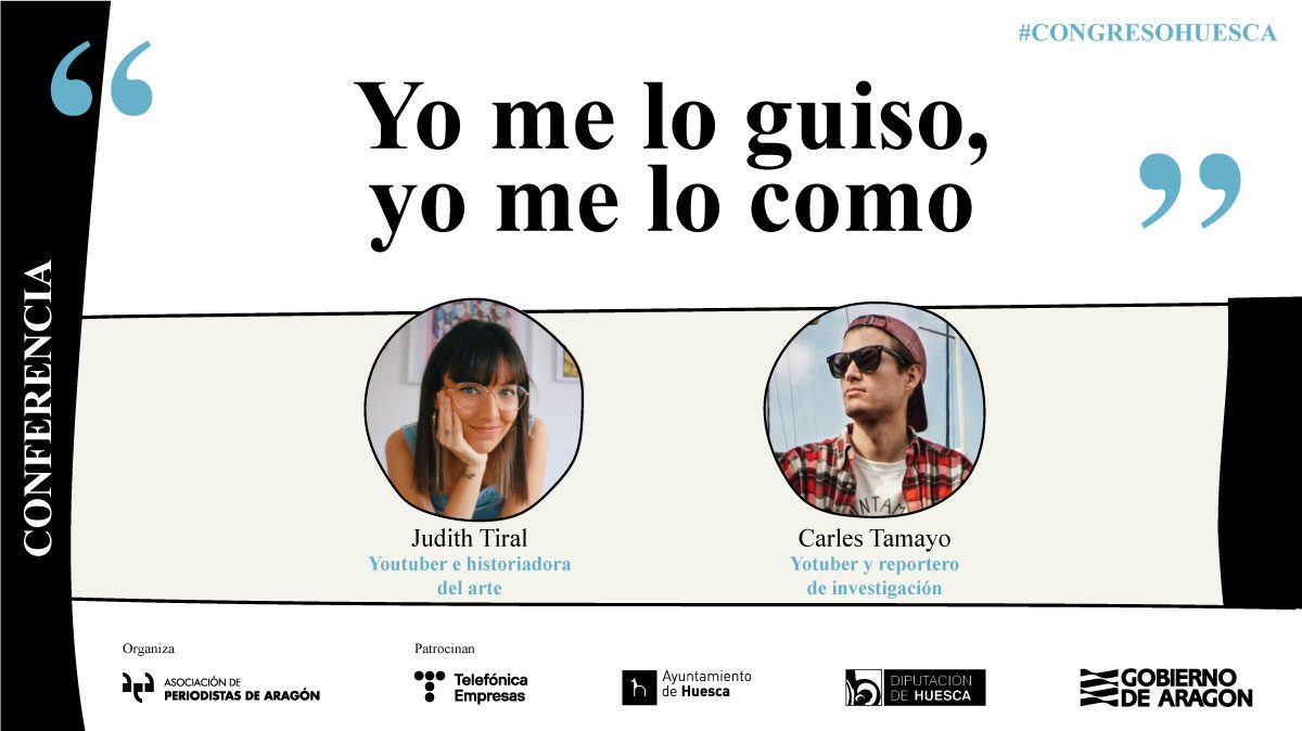 Los youtubers Carles Tamayo y Judith Tiral imparten la conferencia “Yo me lo guiso, yo me lo como” en el XXIII Congreso de Periodismo de Huesca, que se celebra el 24 y 25 de marzo en el Palacio de Congresos de la ciudad. Ambos abordarán la producción y las estrategias de promoción de los contenidos creados en redes sociales, en una sesión el jueves, a las 13.30 horas.