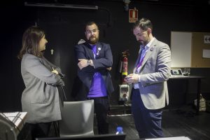 Luces, sonido, pantallas, atrezzo. El equipo técnico del palacio del auditorio ilumina y sonoriza el espacio y las ponencias que pasan por el escenario. Y junto a ellos, los miembros de la organización del Congreso de periodismo digital. Personas que están entre las bambalinas del escenario (Paul y Peibols), con los ponentes, gestionando las entrevistas, con los premios y gestionando la joya más preciada…el tiempo.