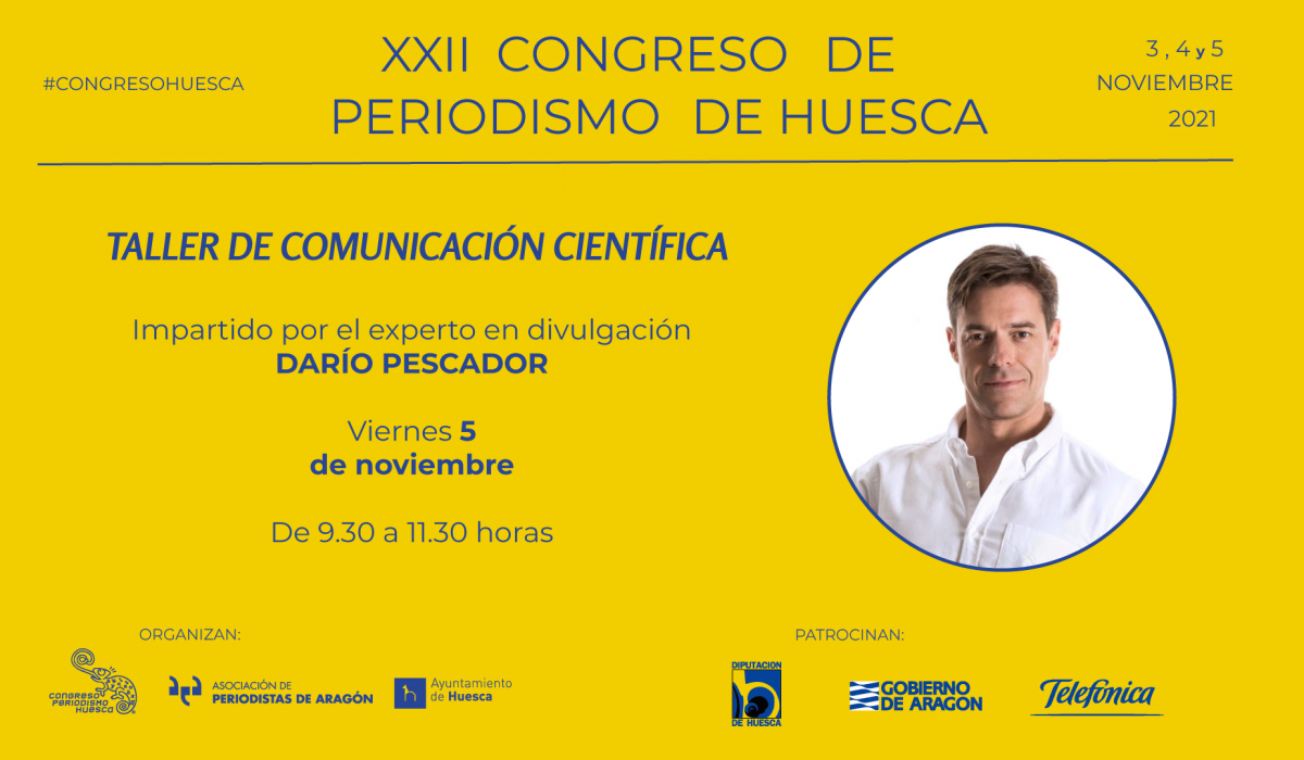 La Comunicación científica no solo es un servicio esencial de los medios de comunicación a la sociedad, también es un arte, una ciencia y, en los últimos tiempos, una necesidad frente a la desinformación y los bulos. Por ello, el Congreso de Periodismo de Huesca apuesta por un workshop impartido por Darío Pescador, consultor experto en medios digitales y con una dedicación de más de 20 años en el campo de la divulgación científica. Escribir Ciencia para seres humanos, captar atención a través de esta materia y conocer su viralidad y aplicaciones multimedia son los principales objetivos de este taller, que se desarrollará de 9.30 a 11.30 horas.