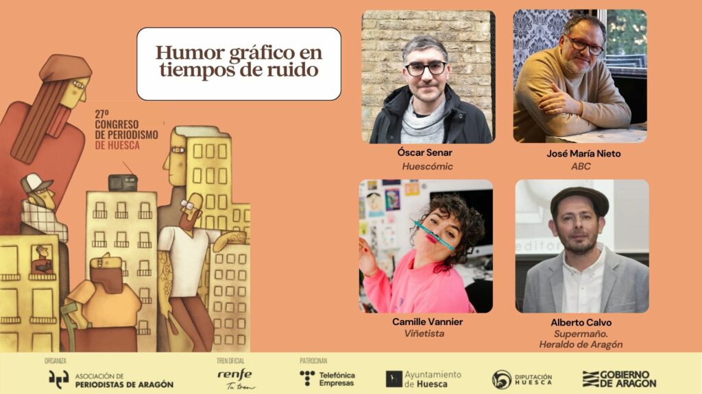 Acto seguido, a las 13.30 horas, tendrá lugar la mesa ‘Humor gráfico en tiempos de ruido’, dedicada al papel de la sátira y la ilustración en el debate público actual. Moderada por Óscar Senar, coordinador de Huescómic, participarán José María Nieto, humorista gráfico del diario ABC; Alberto Calvo, creador del personaje Supermaño y colaborador de Heraldo de Aragón, y la ilustradora y autora de novela gráfica Camille Vannier.